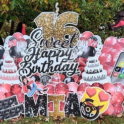 This package is ideal for THEMED occasions, and includes everything in the Simply Special Package. Customers can select up to three colors to be highlighted. Our RAZZLE DAZZLE signs feature two or more tiers and are reserved for two days (48 hours) , priced at $160. Examples of themes include Sports, Music, Fashion, Travel, Sweet 16, Spider Man, Little Mermaid, and more.